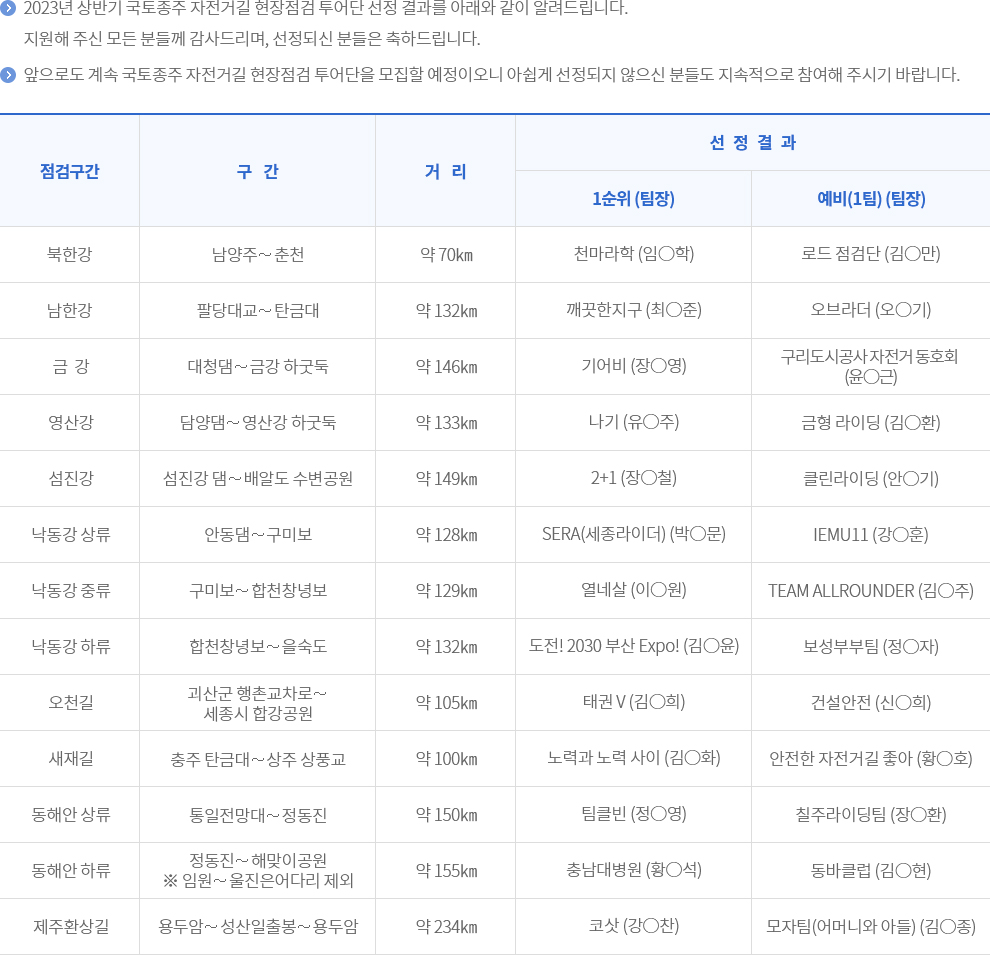 2023년 상반기 국토종주 자전거길 현장점검 투어단 선정결과