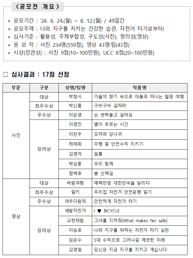 2024 자전거 이용 활성화를 위한 사진 영상 공모전 수상작 선정 결과를 발표합니다.